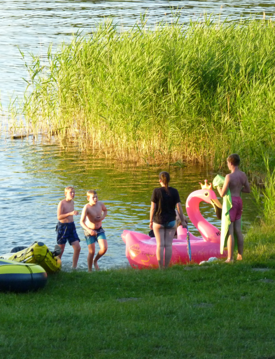 Unser Campingplatz bietet eine eigene Badestelle mit flachem Strand direkt an der großen Wiese, ideal für kleine Kinder. Eine Leine im Wasser trennt den Nichtschwimmer- vom Schwimmerbereich.