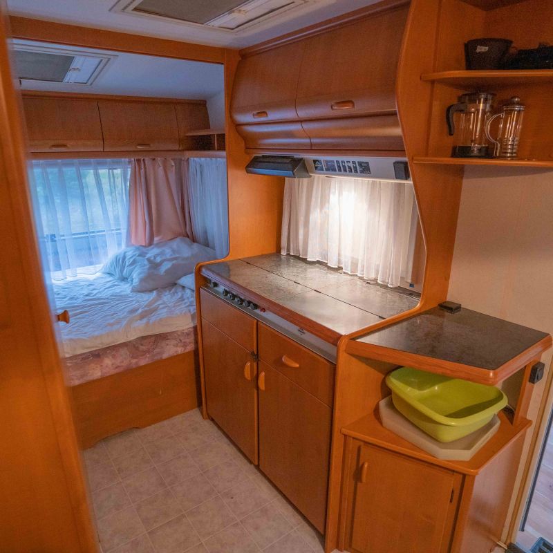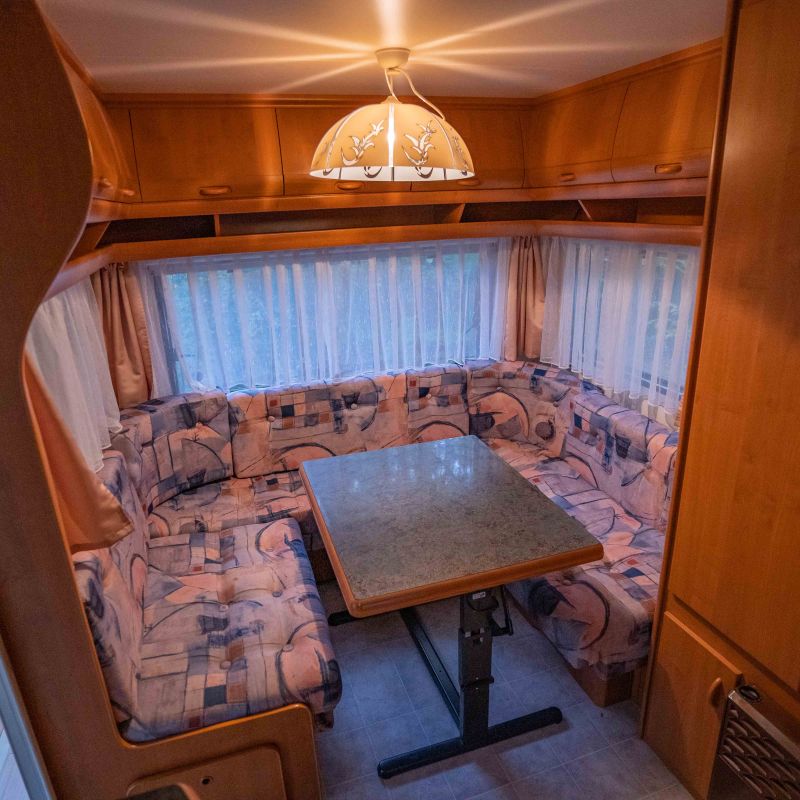 Unser gut ausgestatteter Wohnwagen bietet Platz für bis zu 4 Personen: Doppelbett und Sitzecke, die zur Liegefläche umgebaut werden kann. Kühlschrank, Gaskocher, Geschirr und Töpfe sowie Kissen und Decken sind vorhanden.