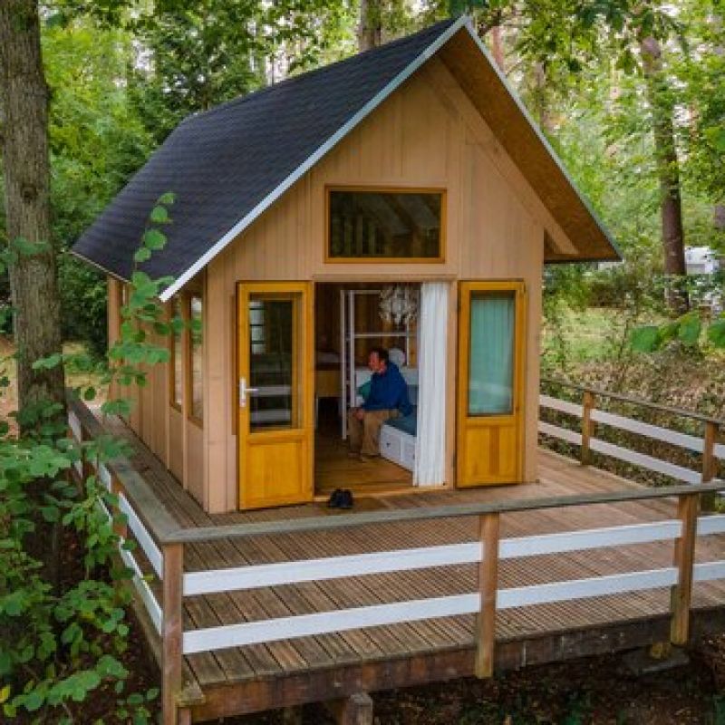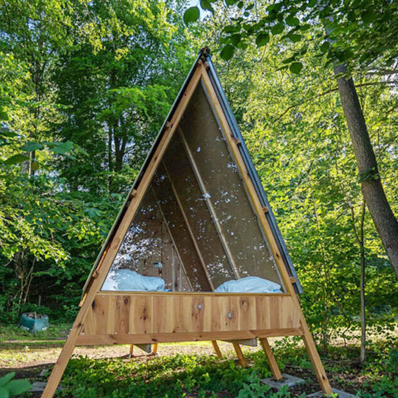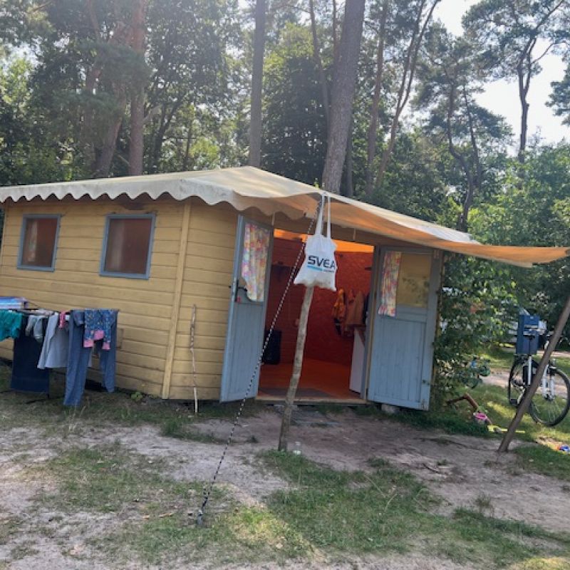 Unsere zwei holländischen Holzzelte sind sechseckige Häuschen mit Zeltdach und bieten Platz für bis zu 5 Personen: ein Doppelbett und ein Etagenbett mit drei Betten, Kissen und Decken. Ausgestattet mit Küchenzeile (Doppelkochplatte, Kühlschrank, Geschirr und Töpfe) sowie Essecke.