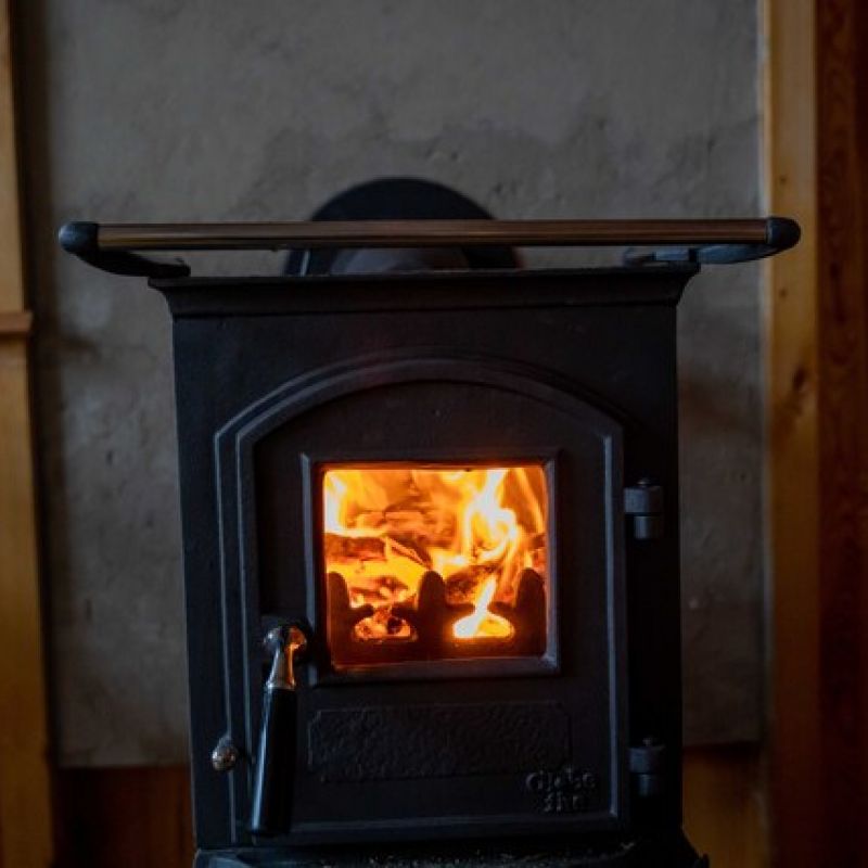 Sie verfügen über eine Küchenzeile mit Doppelkochplatte, Kühlschrank, Geschirr und Töpfen sowie einen kleinen gußeisernen Holzofen für gemütliche Wärme.